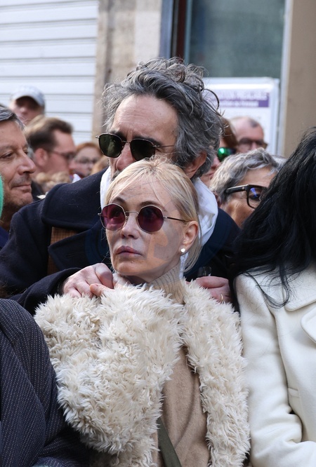 Emmanuelle Béart et son mari Frederic Chaudier - Les célébrités participent à la marche silencieuse pour la paix au Proche-Orient, entre l'Institut du monde arabe et le musée d'art et d'histoire du judaïsme à Paris, le 19 novembre 2023. A l'appel d'un collectif de 600 personnalités du monde de la culture, plusieurs milliers de personnes ont rejoint le cortège. © Denis Guignebourg / Bestimage Celebrities participate in the silent march for peace in the Middle East, between the Institute of the Arab World and the Museum of Art and History of Judaism in Paris, November 19, 2023. At the call of a collective of 600 personalities from the world of culture, several thousand people joined the procession.