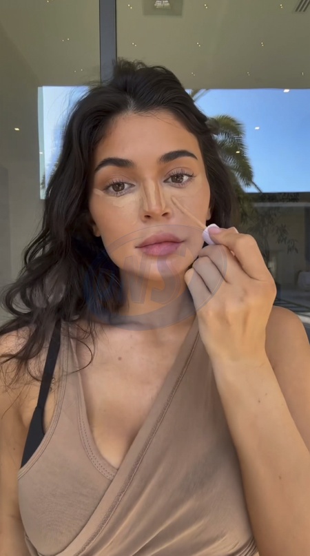 Screenshot of Kylie Jenner, latest post on social media, 19th November 2023.Quote:"quick everyday makeup using @kyliecosmetics power plush longwear concealer shade 4.5WN & 9W concealer brush ‘Way To Glow' glow balm ‘Love That 4 U' tinted butter balm", Credit:B4859 / Avalon