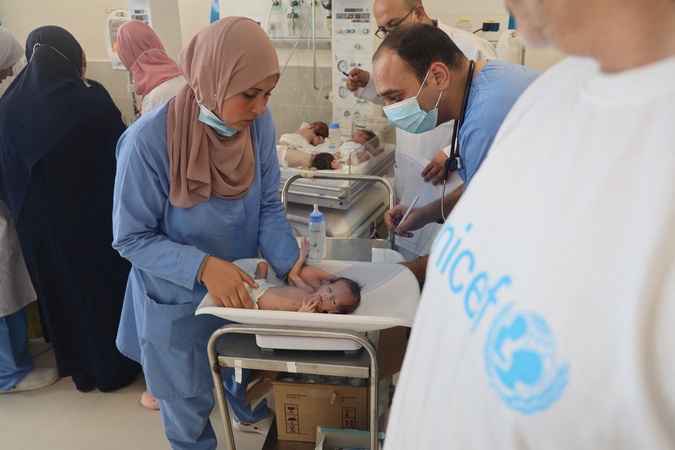 On 19 November 2023, babies rescued from Al-Shifa hospital in northern Gaza are relocated to the Al-Helal Al-Emarati Hospital in Rafah, in the south of the Strip. Thirty-one babies clinging to life were rescued from Al-Shifa hospital in northern Gaza and relocated to the south of the Strip. UNICEF, working with WHO, UNRWA, OCHA, UNMAS, as part of an interagency UN effort, alongside the Palestinian Red Crescent Society, medical authorities and staff at the hospital conducted the operation during extremely dangerous conditions. The newborns' condition was rapidly deteriorating, and follows the tragic death of several other babies, and total collapse of all medical services at Al-Shifa. The newborns were transferred, following requests from the health authorities, in temperature-controlled incubators under the supervision of medical staff from Al-Shifa hospital to the Al-Helal Al-Emarati Hospital in Rafah, southern Gaza, where their condition is now being stabilized and they are being cared for in the neonatal intensive care unit. UNICEF and partners are supporting the identification and registration of the babies to help trace and reunify them with their parents and family members where possible. © Eyad El Baba/UNICEF via Bestimage