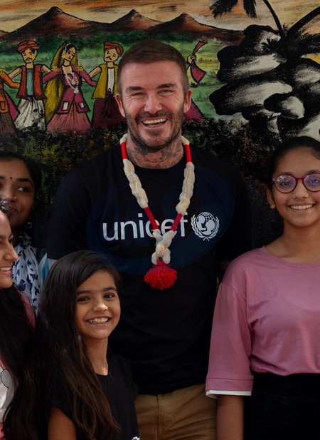 On 14 November 2023 in India, UNICEF Goodwill Ambassador David Beckham (centre) poses for a photo with adolescents at the community centre in the Banaskantha district of Gujarat state. Mr. Beckham has come to meet with adolescents who are champions of child rights and to hear their personal stories of empowerment – how they have stood up to reject child labour and child marriage and have fought to prevent gender-based violence – as well as descriptions of the support they have received from the community in various ways, including through mental health and psychosocial support (MHPSS). Mr. Beckham travelled to India this week to meet children and adolescents, including girls who are bringing about change and innovation in their communities, and young women who have overcome barriers to help close gender gaps. During his four-day visit, Beckham saw first-hand how UNICEF-supported programmes are making a difference for girls and women, in partnership with the Government of India. The aim of the visit to the community centre was to give a deeper understanding of the context and effective initiatives by community, government and civil society organizations to ensure that every child is protected and empowered (with a gender and equity focus). Adolescents shared their dreams, aspirations, journey so far and the obstacles they have overcome along the way. Community members, front line workers and government functionaries added their experiences, perspectives and insights on the changing times and how the community supports adolescents on their path to greater empowerment, as well as challenges they have faced and how they have overcome them. © Anindita Mukherjee/UNICEF via Bestimage