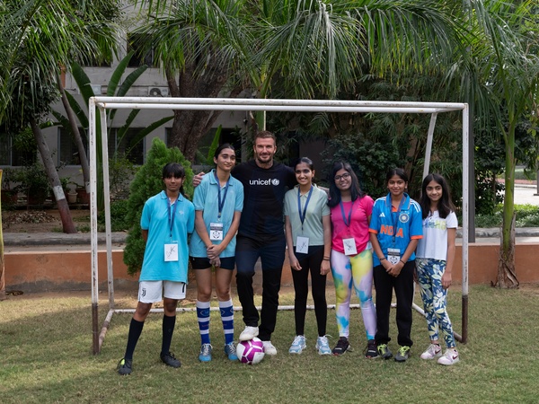 On 13 November 2023 in India, UNICEF Goodwill Ambassador David Beckham (in UNICEF T-shirt) poses with children after playing a friendly game of football at Gujarat University in Ahmedabad. During his visit to the University, Mr. Beckham also met youth innovators as well as women entrepreneurs participating in the herSTART programme, who presented their ideas and prototypes at the Vikram Sarabhai Children Innovation Centre (VSCIC) of the Gujarat University Start Up and Entrepreneurship Council (GUSEC). Mr. Beckham travelled to India this week to meet children and adolescents, including girls who are bringing about change and innovation in their communities, and young women who have overcome barriers to help close gender gaps. During his four-day visit, Beckham saw first-hand how UNICEF-supported programmes are making a difference for girls and women, in partnership with the Government of India. UNICEF and its local partner, Elixir, have collaboratively set up the ‘Gujarat Youth Forum' (GYF) to inspire young people to become change-makers. For the past two years, GYF has worked intensively with young people through various initiatives, programmes and campaigns. Adolescents and young people are one of UNICEF's key partners in achieving results and driving sustainable change. UNICEF is enhancing the capacities of governments, service providers and partners to engage with children and young people, and to create opportunities and platforms to ensure their meaningful participation in the decisions that affect their lives and their communities. © Anindita Mukherjee/UNICEF via Bestimage