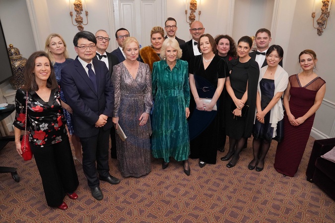 Queen Camilla with Foreign Press Association director Deborah Bonetti (third from left), president Dagmar Seeland (fifth from right) and committee members at the annual awards ceremony of the Foreign Press Association, which is celebrating its 135th anniversary, at Sheraton Grand Park Lane, London. Picture date: Monday November 20, 2023., Credit:Jonathan Brady / Avalon
