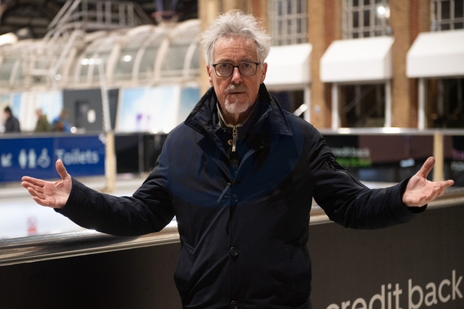 Actor/comedian Griff Rhys Jones poses at Liverpool Street Station in London, England, UK on Tuesday 21 November, 2023 where he is leading a campaign to stop its redevelopment. He has taken on the role of president of The Liverpool Street Station Campaign (LISSCA) which is comprised of Historic Buildings & Places, The Twentieth Century Society, Council for British Archaeology, Save Britain's Heritage, The Georgian Group, The Spitalfields Trust, Civic Voice, The London Historians, The Betjeman Society and The Victorian Society.Sellar, the developer of The Shard, proposes to flatten much of Liverpool Street Station to enable construction of an office and hotel block. Being the third busiest station in the country, Stellar claims the redevelopment is necessary in order to improve passenger facilities and access. Designed by Architect's Herzog & de Meuron, the existing concourse and southern end of the glazed train shed will be replaced with a new two level concourse that will sit beneath the new tower. The natural light and airy space that passengers currently experience will be lost. The main, lower concourse that will connect the platforms with the tube will be entirely enclosed and movement hampered by support pillars., Credit:Justin Ng / Avalon