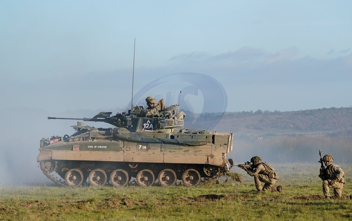The Prince of Wales, Colonel-in-Chief, 1st Battalion Mercian Regiment rides in a Warrior Armoured Fighting Vehicle as he takes part in an attack exercise during a visit to the regiment, in the south west of the UK, for the first time following his appointment to the role by King Charles III., Credit:Andrew Matthews / Avalon