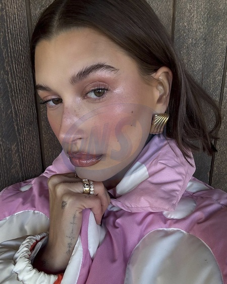 Screenshot of Hailey Bieber, latest post on social media, 22nd November 2023.Quote:"my birthday peptide lip tint in flavor jelly bean comes out tomorrow at 9am pst @rhode", Credit:B4859 / Avalon