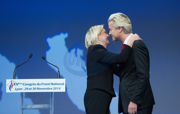Info - Aux Pays-Bas, l'extrême droite de Geert Wilder remporte les législatives, selon les sondages - Marine Le Pen et Geert Wilders (Hollande) - Remise des glaives d'honneur lors du 15ème Congrès du Front National à Lyon. Le 29 novembre 2014 15th congress of the party, in Lyon, France on November 29, 2014