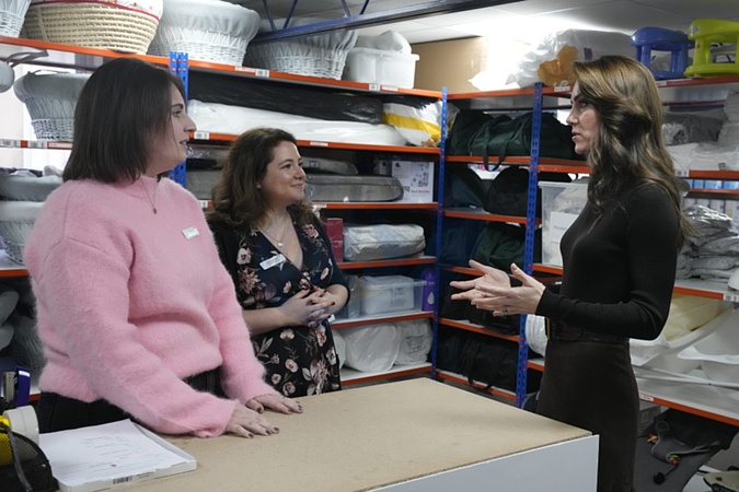 Kate, Princess of Wales, right with Bianca Sakol, centre, Founder of Sebby's Corner, and Emma Parker the operations manger talk during her visit to Sebby's Corner in north London, Friday, Nov. 24, 2023. The Royal Foundation Centre for Early Childhood to provide support to families with young children in the run up to Christmas. Sebby's Corner was formed in January 2021 and provides items to families in need across Barnet, Hertfordshire and London. NO UK USE FOR 48 HOURS, Credit:Avalon.red / Avalon