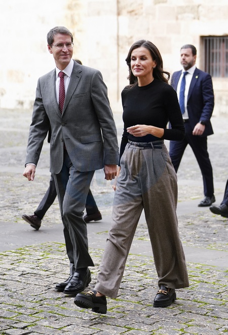 La reine Letizia d'Espagne à la sortie de la cérémonie de clôture du XVIe "Séminaire international sur la langue et le journalisme" au monastère de Yuso à San Millan de la Cogolla, Espagne, le 24 novembre 2023. Queen Letizia attends the closing ceremony of the XVI ‘International Seminar on Language and Journalism' at the Monastery of Yuso in San Millan de la Cogolla, La Rioja, Spain, on November 24, 2023.