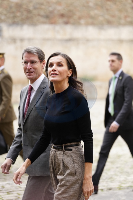 La reine Letizia d'Espagne à la sortie de la cérémonie de clôture du XVIe "Séminaire international sur la langue et le journalisme" au monastère de Yuso à San Millan de la Cogolla, Espagne, le 24 novembre 2023. Queen Letizia attends the closing ceremony of the XVI ‘International Seminar on Language and Journalism' at the Monastery of Yuso in San Millan de la Cogolla, La Rioja, Spain, on November 24, 2023.