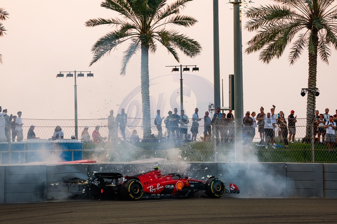Accident du pilote Carlos Sainz lors des essais du Grand Prix de F1 d'Abou Dabi, le 24 novembre 2023. © DPPI / Panoramic / Bestimage 55 SAINZ Carlos (spa), Scuderia Ferrari SF-23, action crash, accident, during the 2023 Formula 1 Etihad Airways Abu Dhabi Grand Prix, 22th round of the 2023 Formula One World Championship from November 24 to 26, 2023 on the Yas Marina Circuit, in Abu Dhabi -