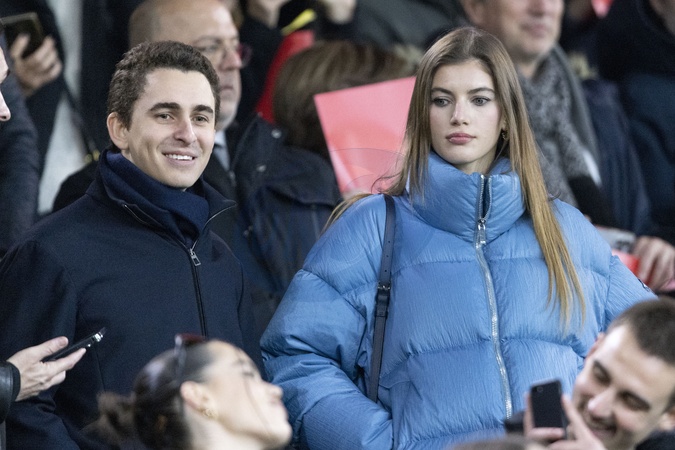 Dimitri Varsano et sa compagne Valery Kaufman dans les tribunes lors du match de Ligue 1 Uber Eats "PSG - Monaco (5-2)" au Parc Des Princes, le 24 novembre 2023. © Cyril Moreau/Bestimage Celebrities in the stands during the match of Ligue 1 Uber Eats "PSG - Monaco (5-2)" at the Parc des Princes. Paris, November 24th, 2023.