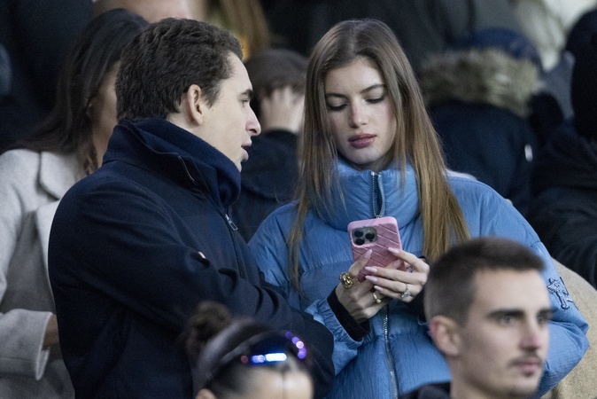 Dimitri Varsano et sa compagne Valery Kaufman dans les tribunes lors du match de Ligue 1 Uber Eats "PSG - Monaco (5-2)" au Parc Des Princes, le 24 novembre 2023. © Cyril Moreau/Bestimage Celebrities in the stands during the match of Ligue 1 Uber Eats "PSG - Monaco (5-2)" at the Parc des Princes. Paris, November 24th, 2023.