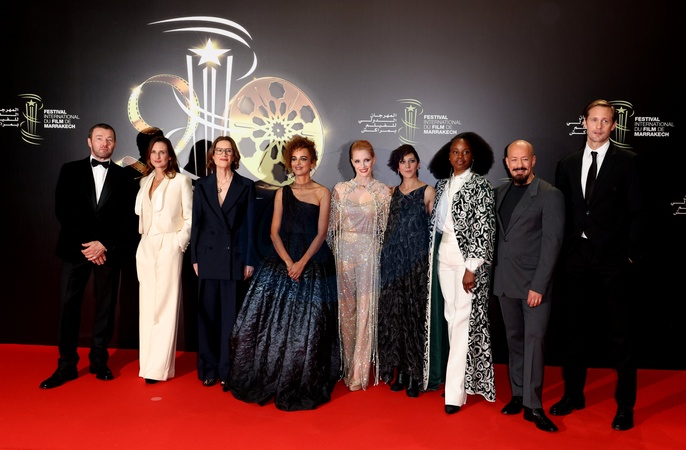 Les membres du jury, Joel Edgerton, Camille Cottin, Joanna Hogg, Leïla Slimani, Jessica Chastain, Zar Amir, Dee Rees, Tarik Saleh, Alexander Skarsgard au photocall de la cérémonie d'ouverture et de la projection du film "Hit Man" lors du 20ème Festival International du Film de Marrakech, Maroc, le 24 novembre 2023. © Dominique Jacovides/Bestimage Celebs attending the opening ceremony and screening of "Hit Man" during the 20th Marrakech International Film Festival on November 24, 2023 in Marrakech, Morocco.