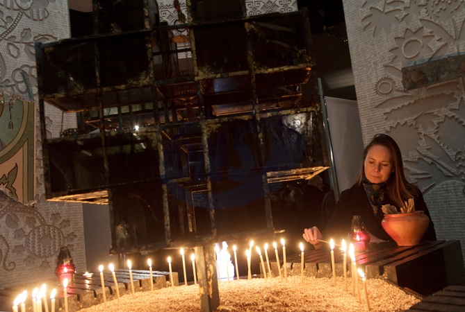 KYIV, UKRAINE - NOVEMBER 25, 2023 - A woman lights a candle in memory of the victims during the events commemorating the 90th anniversary of the Holodomor of 1932-1933, the genocide of the Ukrainian people, at the National Museum of the Holodomor-Genocide on Holodomor Remembrance Day, Kyiv, capital of Ukraine. On the fourth Saturday of November, Ukraine commemorates the victims of the Holodomor, the 1932–33 man-made famine that killed millions., Credit:Kirill Chubotin / Avalon