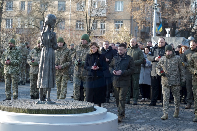 KYIV, UKRAINE - NOVEMBER 25, 2023 - President of Ukraine Volodymyr Zelenskyy and his spouse Olena Zelenska place the vigil lanterns at the Bitter Memory of Childhood monument at the National Museum of the Holodomor-Genocide on Holodomor Remembrance Day, Kyiv, capital of Ukraine. On the fourth Saturday of November, Ukraine commemorates the victims of the Holodomor, the 1932–33 man-made famine that killed millions., Credit:Kirill Chubotin / Avalon