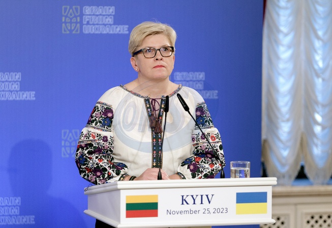 KYIV, UKRAINE - NOVEMBER 25, 2023 - Prime Minister of the Republic of Lithuania Ingrida Simonyte attends a press conference following the Second International Summit of the Grain from Ukraine Initiative, Kyiv, capital of Ukraine., Credit:Kirill Chubotin / Avalon