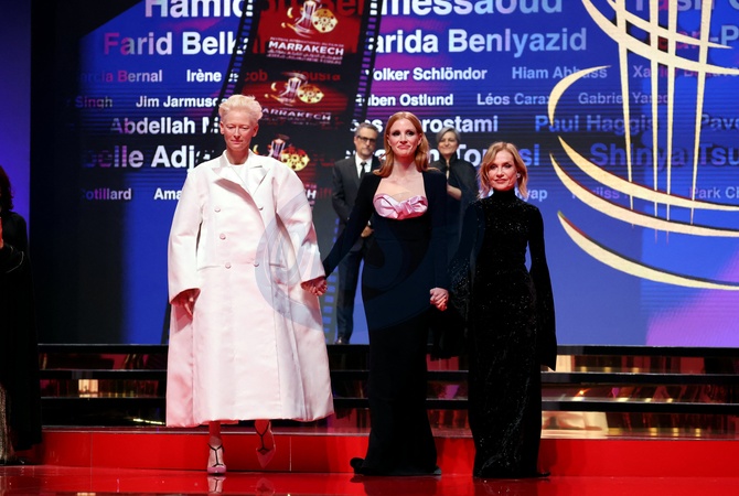 Tilda Swinton, Jessica Chastain, Isabelle Huppert à la soirée d'anniversaire pour les 20 ans du Festival International du Film de Marrakech, Maroc, le 25 novembre 2023. © Dominique Jacovides/Bestimage Celebs attending the ceremony for the 20th annual Marrakech International Film Festival on November 25, 2023 in Marrakech, Morocco.