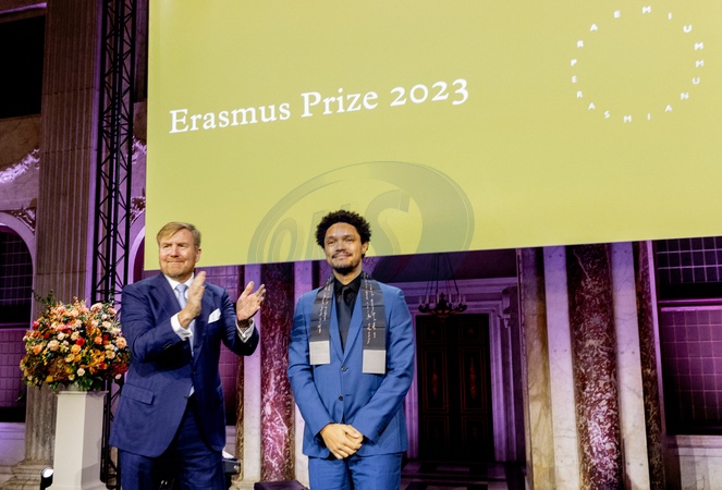Le roi Willem-Alexander des Pays-Bas remet au comédien sud-africain Trevor Noah le prix Erasmus au palais royal à Amsterdam, en présence de La princesse Beatrix des Pays-Bas, le 28 novembre 2023. Le thème du prix de cette année est "Éloge de la folie". "En tant qu'humoriste, animateur de télévision, commentateur politique, philanthrope et auteur, Trevor Noah a pris avec confiance sa place au centre de la satire politique contemporaine. Dans son autobiographie « Born a Crime », Noah décrit comment, en tant qu'enfant d'une mère noire Xhosa et d'un père blanc suisse pendant l'apartheid, il a été confronté très tôt au racisme et à la violence institutionnels. A partir de cette expérience, il affronte l'injustice et nous montre son absurdité; non pas avec cynisme, mais avec le pouvoir libérateur du rire", indique le rapport du jury. Selon ce dernier, il a été un souffle d'air frais dans un paysage médiatique férocement polarisé. Le prix Erasmus est décerné chaque année à une personne ou une institution qui a apporté une contribution importante aux sciences humaines, sociales et artistiques dans le cadre des traditions culturelles européennes. Le prix Erasmus est doté de la somme de 150.000 euros. Au cours de ses 65 années d'existence, le prix avait été décerné à un autre humoriste en la personne de C.Chaplin des mains du prince Bernhard en 1965. King Willem-Alexander will presented the Erasmus Prize to the South African comedian Trevor Noah (Johannesburg, 1984) in the Royal Palace Amsterdam. The King is Regent of the Praemium Erasmianum Foundation. The theme of this year's prize is 'Praise of Folly'. Princess Beatrix will also be present at the ceremony. The jury awards Noah the prize for his inspired contribution to the theme area 'Praise of Folly,' named after Erasmus' book that focuses on humor, social criticism and political satire. With his talent for mocking, linguistic and connecting political humor, Noah acts 'in an Erasmian spirit,' according to the jury. "As a humorist, television host, political commentator, philanthropist and author, Trevor Noah has confidently taken his place at the focal point of contemporary political satire. In his autobiography 'Born a Crime', Noah describes how, as the child of a black Xhosa mother and a white Swiss father during Apartheid, he was confronted with institutional racism and violence early in his life. From that experience he confronts injustice and shows us its absurdity; not with cynicism, but with the liberating power of laughter,” said the jury report. With his reflections on issues such as the rise of 'fake news', the presidency of D.Trump, the Covid-19 pandemic and Black Lives Matter, he attracted a young, diverse audience worldwide and, according to the jury, he was a breath of fresh air in a fierce polarized media landscape. The Erasmus Prize is awarded annually to a person or institution that has made an important contribution to the humanities, social sciences and the arts within the framework of Europe's cultural traditions. The Praemium Erasmianum Foundation focuses on a different theme every year. The prize consists of a cash prize of 150,000 euros. In its 65-year existence, a humorist has won the Erasmus Prize once before: Charlie Chaplin received the prize from Prince Bernhard in 1965.
