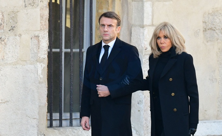Le président de la République française Emmanuel Macron et la première Dame française Brigitte Macron - Arrivées aux obsèques de Gérard Collomb en la cathédrale Saint-Jean à Lyon le 29 novembre 2023. © Romain Doucelin/Bestimage Arrivals at the funeral of Gérard Collomb at Saint-Jean Cathedral in Lyon on November 29, 2023.