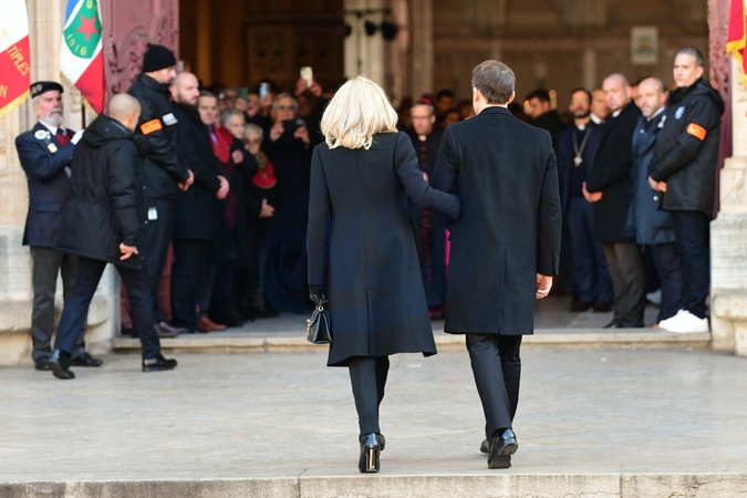 Le président de la République française Emmanuel Macron et la première Dame française Brigitte Macron - Arrivées aux obsèques de Gérard Collomb en la cathédrale Saint-Jean à Lyon le 29 novembre 2023. © Romain Doucelin/Bestimage Arrivals at the funeral of Gérard Collomb at Saint-Jean Cathedral in Lyon on November 29, 2023.