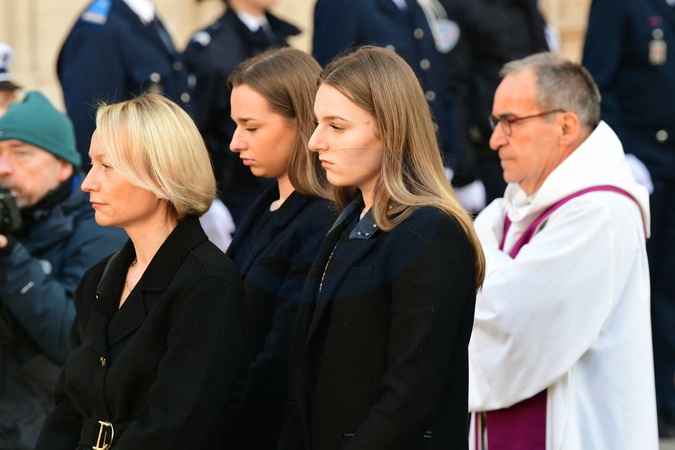 La veuve Anne-Laure Collomb et Clémence et Camille (les filles de Gérard Collomb et Caroline Rougé) - Arrivées aux obsèques de Gérard Collomb en la cathédrale Saint-Jean à Lyon le 29 novembre 2023. © Romain Doucelin/Bestimage Arrivals at the funeral of Gérard Collomb at Saint-Jean Cathedral in Lyon on November 29, 2023.