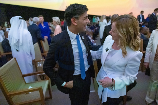 British Prime Minister Rishi Sunak talks to Italian Prime Minister Giorgia Meloni at COP28 in Dubai, United Arab Emirates, on 01 December 2023., Credit:Simon Walker / Avalon