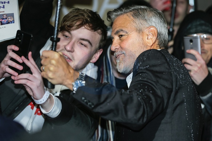 London, UK 03rd Dec 2023. George Clooney, director of the film and Hollywood star takes selfies with fans in the pouring rain, attending a UK special screening of 'The Boys in the Boat' at Curzon Mayfair. The film tells a 1930s-set story centered on the University of Washington's rowing team., Credit:Imageplotter / Avalon