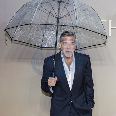 London, UK 03rd Dec 2023. George Clooney, director of the film and Hollywood star, poses with an umbrella in the pouring rain at a UK special screening of 'The Boys in the Boat' at Curzon Mayfair. The film tells a 1930s-set story centered on the University of Washington's rowing team., Credit:Imageplotter / Avalon