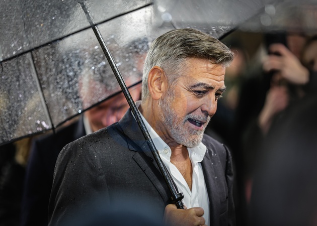 London, UK 03rd Dec 2023. George Clooney, director of the film and Hollywood star, poses with an umbrella in the pouring rain at a UK special screening of 'The Boys in the Boat' at Curzon Mayfair. The film tells a 1930s-set story centered on the University of Washington's rowing team., Credit:Imageplotter / Avalon
