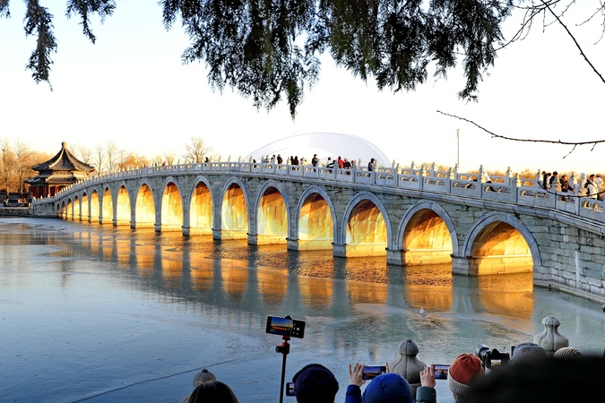 Sunset rays illuminate the Seventeen-Arch Bridge at the Summer Palace in Beijing, China, 1 December, 2023., Credit:Liu Xianguo / Avalon