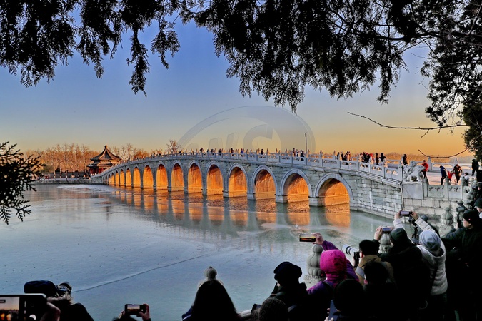 Sunset rays illuminate the Seventeen-Arch Bridge at the Summer Palace in Beijing, China, 1 December, 2023., Credit:Liu Xianguo / Avalon