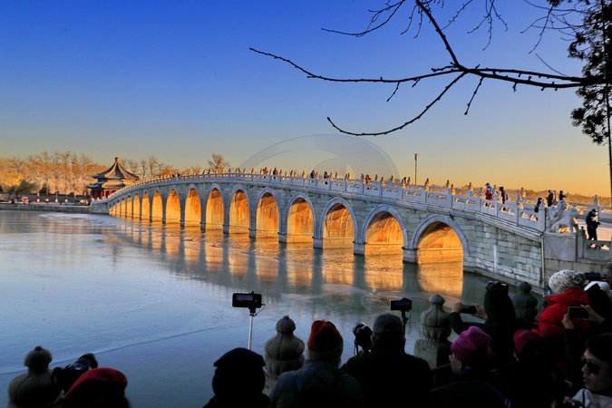 Sunset rays illuminate the Seventeen-Arch Bridge at the Summer Palace in Beijing, China, 1 December, 2023., Credit:Liu Xianguo / Avalon