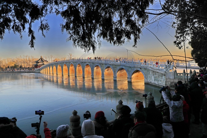 Sunset rays illuminate the Seventeen-Arch Bridge at the Summer Palace in Beijing, China, 1 December, 2023., Credit:Liu Xianguo / Avalon