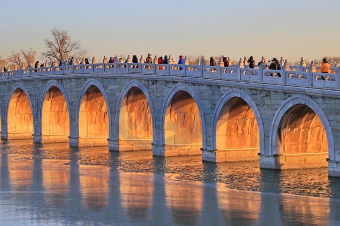 Sunset rays illuminate the Seventeen-Arch Bridge at the Summer Palace in Beijing, China, 1 December, 2023., Credit:Liu Xianguo / Avalon