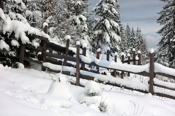 YABLUNYTSIA, UKRAINE - NOVEMBER 30, 2023 - Snow stays on the fence in the Ukrainian Carpathians, Yablunytsia village, Ivano-Frankivsk Region, western Ukraine., Credit:Yurii Rylchuk / Avalon