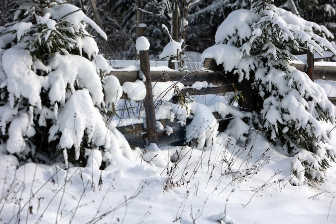 YABLUNYTSIA, UKRAINE - NOVEMBER 30, 2023 - Snow blankets spruce trees and a fence in the Ukrainian Carpathians, Yablunytsia village, Ivano-Frankivsk Region, western Ukraine., Credit:Yurii Rylchuk / Avalon