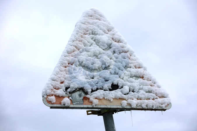 YABLUNYTSIA, UKRAINE - NOVEMBER 30, 2023 - Snow covers a road sign in the Ukrainian Carpathians, Yablunytsia village, Ivano-Frankivsk Region, western Ukraine., Credit:Yurii Rylchuk / Avalon