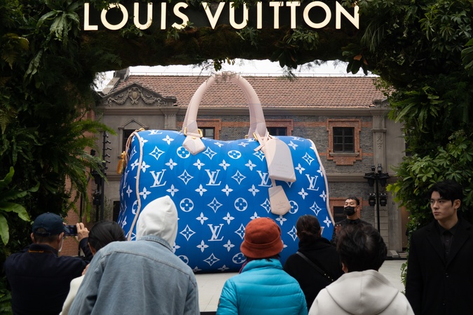 A view of a scaled-up mock of a Louis Vuitton bag during a promotional event by the French luxury brand in Shanghai, China Monday, Dec. 04, 2023., Credit:WANG GANG / Avalon