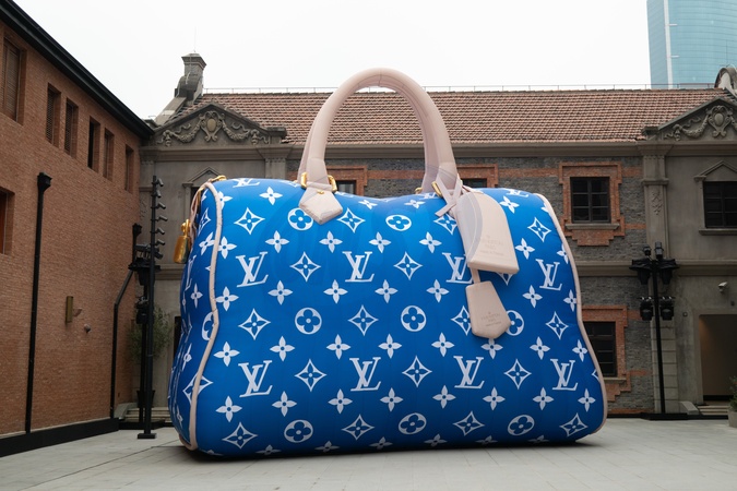A view of a scaled-up mock of a Louis Vuitton bag during a promotional event by the French luxury brand in Shanghai, China Monday, Dec. 04, 2023., Credit:WANG GANG / Avalon