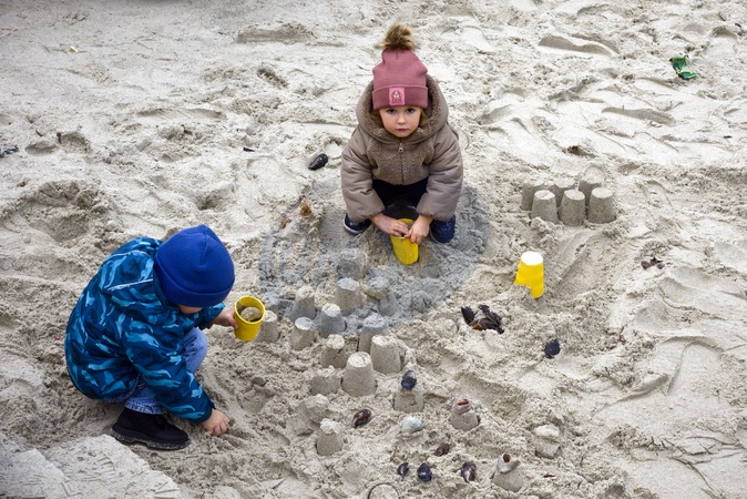 ODESA, UKRAINE - DECEMBER 3, 2023 - A boy and a girl play in the sand on the beach by the Black Sea in winter, Odesa, southern Ukraine., Credit:Yulii ZozuliaI / Avalon