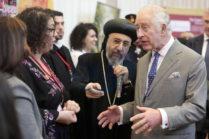 Britain's King Charles III and Archbishop Angaelos, centre, talks to guests as they attend an Advent Service and Christmas Reception at The Coptic Orthodox Church Centre UK in Stevenage, England, Tuesday, Dec. 5, 2023. After the Service, the King met young volunteers from the Church's ministries and members of the Coptic Orthodox Church Congregation, unveiled a plaque and planted a tree., Credit:Kin Cheung / Avalon