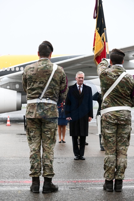Le roi Philippe et la reine Mathilde de Belgique lors de leur visite officielle en Allemagne, le 5 décembre 2023. © Frédéric Andrieu/Bestimage Her Majesty The King Philippe and the Queen Mathilde take part of the State visit in Federal Republic of Germany for three days. Official Departure Ceremony in Melsbroek airport © F.Andrieu / Agencepeps