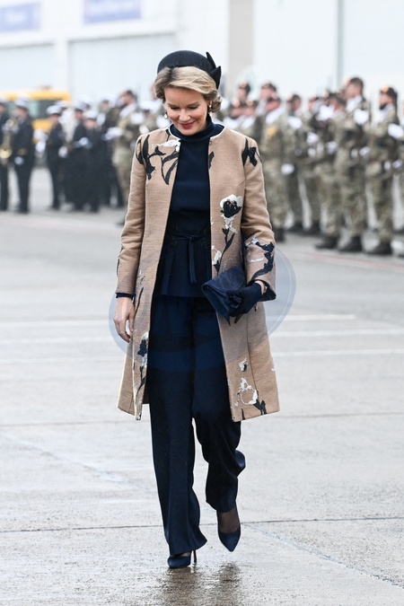 Le roi Philippe et la reine Mathilde de Belgique lors de leur visite officielle en Allemagne, le 5 décembre 2023. © Frédéric Andrieu/Bestimage Her Majesty The King Philippe and the Queen Mathilde take part of the State visit in Federal Republic of Germany for three days. Official Departure Ceremony in Melsbroek airport © F.Andrieu / Agencepeps