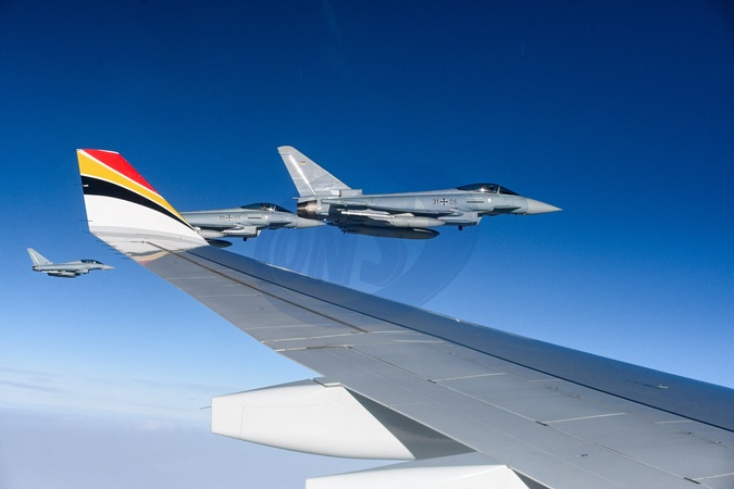 Le roi Philippe et la reine Mathilde de Belgique lors de leur visite officielle en Allemagne, le 5 décembre 2023. © Frédéric Andrieu/Bestimage Her Majesty The King Philippe and the Queen Mathilde take part of the State visit in Federal Republic of Germany for three days. Eurofighters escort the fly from king Philippe and Queen Mathilde © F.Andrieu / Agencepeps