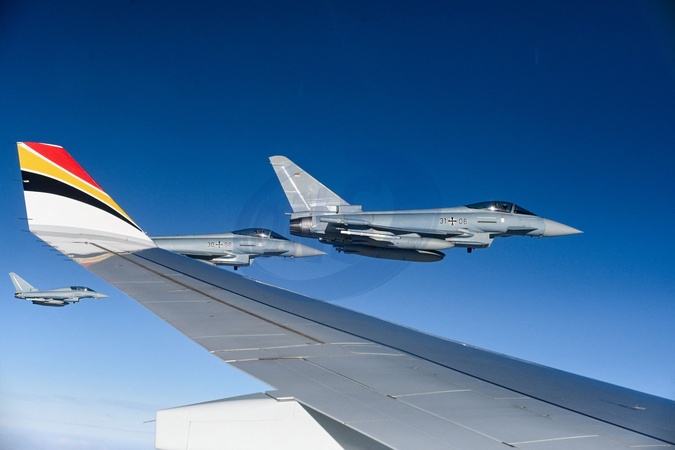 Le roi Philippe et la reine Mathilde de Belgique lors de leur visite officielle en Allemagne, le 5 décembre 2023. © Frédéric Andrieu/Bestimage Her Majesty The King Philippe and the Queen Mathilde take part of the State visit in Federal Republic of Germany for three days. Eurofighters escort the fly from king Philippe and Queen Mathilde © F.Andrieu / Agencepeps