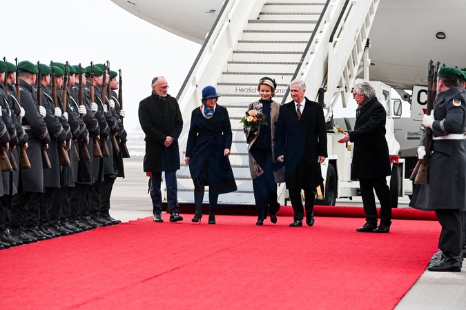 Le roi Philippe et la reine Mathilde de Belgique lors de leur visite officielle en Allemagne, le 5 décembre 2023. © Frédéric Andrieu/Bestimage Her Majesty The King Philippe and the Queen Mathilde take part of the State visit in Federal Republic of Germany for three days. Arrival of TTMM the King and the Queen of the Belgians, the Ministers, the official, business, academic and press delegations at Berlin Brandenburg Airport, Military Section Welcome by State Secretary Dr. Dörte Dinger, Head of the Office of the Federal President, Mr. Volker Timmermann, German Deputy Chief of Protocol and HE Geert Muylle, Ambassador of Belgium in Germany Ceremony on red carpet. © F.Andrieu / Agencepeps