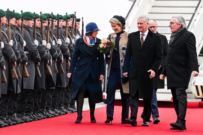 Le roi Philippe et la reine Mathilde de Belgique lors de leur visite officielle en Allemagne, le 5 décembre 2023. © Frédéric Andrieu/Bestimage Her Majesty The King Philippe and the Queen Mathilde take part of the State visit in Federal Republic of Germany for three days. Arrival of TTMM the King and the Queen of the Belgians, the Ministers, the official, business, academic and press delegations at Berlin Brandenburg Airport, Military Section Welcome by State Secretary Dr. Dörte Dinger, Head of the Office of the Federal President, Mr. Volker Timmermann, German Deputy Chief of Protocol and HE Geert Muylle, Ambassador of Belgium in Germany Ceremony on red carpet. © F.Andrieu / Agencepeps