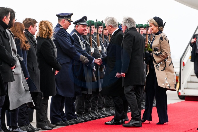 Le roi Philippe et la reine Mathilde de Belgique lors de leur visite officielle en Allemagne, le 5 décembre 2023. © Frédéric Andrieu/Bestimage Her Majesty The King Philippe and the Queen Mathilde take part of the State visit in Federal Republic of Germany for three days. Arrival of TTMM the King and the Queen of the Belgians, the Ministers, the official, business, academic and press delegations at Berlin Brandenburg Airport, Military Section Welcome by State Secretary Dr. Dörte Dinger, Head of the Office of the Federal President, Mr. Volker Timmermann, German Deputy Chief of Protocol and HE Geert Muylle, Ambassador of Belgium in Germany Ceremony on red carpet. © F.Andrieu / Agencepeps