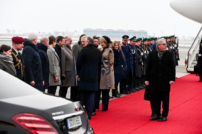 Le roi Philippe et la reine Mathilde de Belgique lors de leur visite officielle en Allemagne, le 5 décembre 2023. © Frédéric Andrieu/Bestimage Her Majesty The King Philippe and the Queen Mathilde take part of the State visit in Federal Republic of Germany for three days. Arrival of TTMM the King and the Queen of the Belgians, the Ministers, the official, business, academic and press delegations at Berlin Brandenburg Airport, Military Section Welcome by State Secretary Dr. Dörte Dinger, Head of the Office of the Federal President, Mr. Volker Timmermann, German Deputy Chief of Protocol and HE Geert Muylle, Ambassador of Belgium in Germany Ceremony on red carpet. © F.Andrieu / Agencepeps