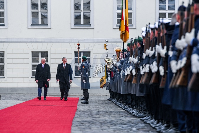 Le roi Philippe et la reine Mathilde de Belgique lors de leur visite officielle en Allemagne, le 5 décembre 2023. © Frédéric Andrieu/Bestimage Her Majesty The King Philippe and the Queen Mathilde take part of the State visit in Federal Republic of Germany for three days. Welcome Ceremony by HE Frank-Walter Steinmeier, President of the Federal Republic of Germany and Mrs. Elke Büdenbender, the First Lady Welcome by President Steinmeier and the First Lady Inspection of the troops by President Steinmeier and HM the King Short encounter with German school children for Their Majesties Presentation of the German and Belgian delegations Signing of the Visitor Book for Their Majesties © F.Andrieu / Agencepeps